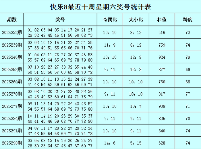 福彩快乐8第2025304期开奖回顾:01 06 17 19 21 30 31 32 33 35 42 49 50 52 59 65 66 68 75 78,其中奖号和值为829,跨度为77,奇偶比为11:9,大小比为10:10。