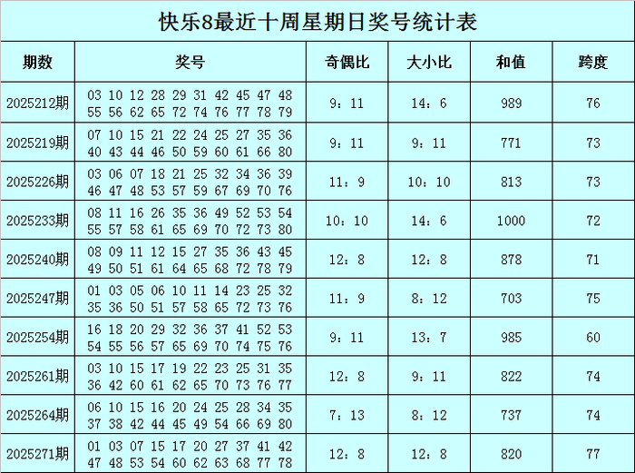 福彩快乐8第2025271期(上周日)开奖回顾:01 03 07 15 17 20 27 37 41 42 47 48 53 54 60 62 63 68 77 78,其中奖号和值为820,跨度为77,奇偶比为12:8,大小比为12:8。