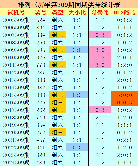 组选类型推荐:历史上排列三第309期同期奖号中,组六出现13期,组三出现7次,今年第309期注意组三号码。