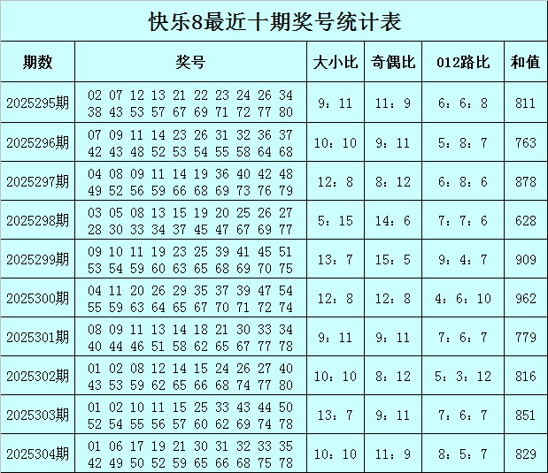 福彩快乐8第2025304期开奖回顾:01 06 17 19 21 30 31 32 33 35 42 49 50 52 59 65 66 68 75 78,其中奖号奇偶比开出11:9,大小比开出10:10,012路比开出8:5:7,和值为829,跨度为77。